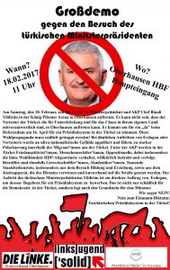 Ich begrüße die angekündigten Proteste linker und antifaschistischer Kräfte gegen den Yildirim-Auftritt in Oberhausen und hoffe auf eine starke Beteiligung. Denn das wäre zugleich eine gute Werbung für ein starkes ´Nein´ auch der in Deutschland lebenden türkischen Staatsbürger beim Referendum.“